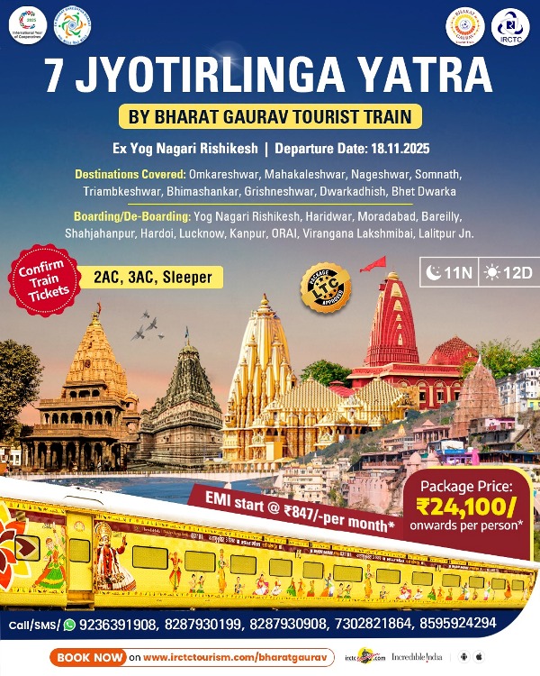 18 नवंबर 2025 से सात ज्योतिर्लिंग यात्रा स्पेशल ट्रेन ऋषिकेश से शुरू होगी। यात्री ऋषिकेश, हरिद्वार, मुरादाबाद, बरेली, हारदोई, लखनऊ, कानपुर, उरई, झांसी और ललितपुर से सवार हो सकेंगे।