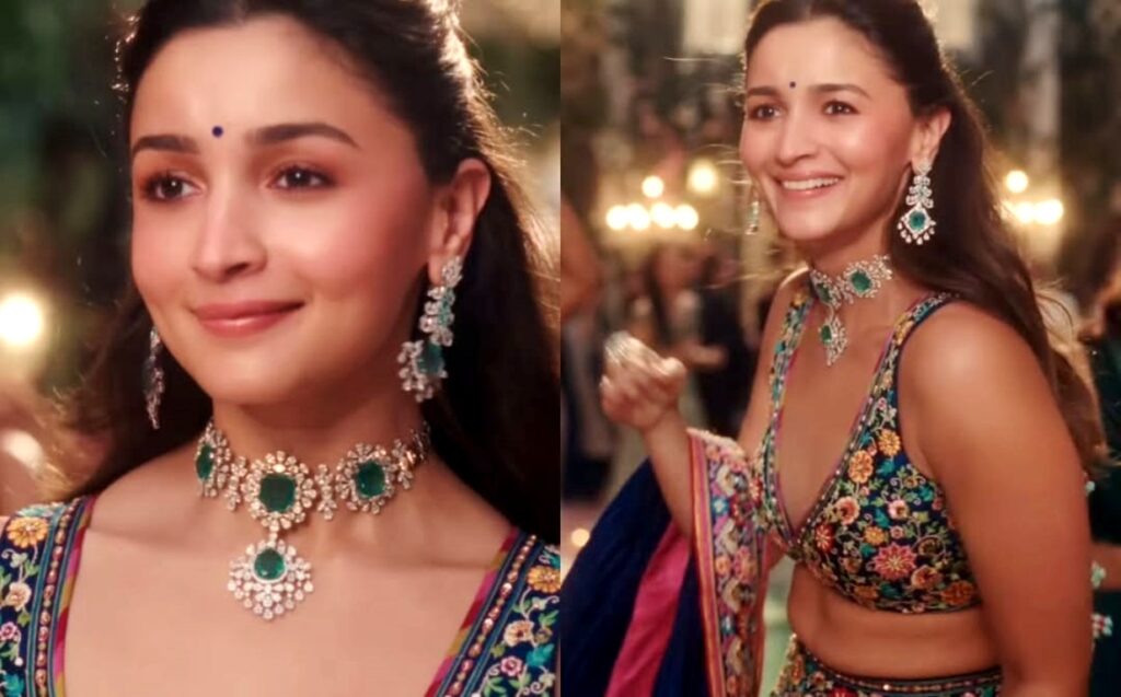 आलिया का पहनावा खास है। उनका लहंगा गहरी नीली क्रश्ड सिल्क से बना है। यह स्कर्ट पानी की तरह हिलती है और हर कदम पर चमकती है। लहंगे के साथ बारीक कढ़ाई वाला ब्लाउज है। चोली पर रंगीन फूलों की कढ़ाई खूबसूरती से की गई है। कमरबंद और दुपट्टे का बॉर्डर भी सूती कढ़ाई में है।