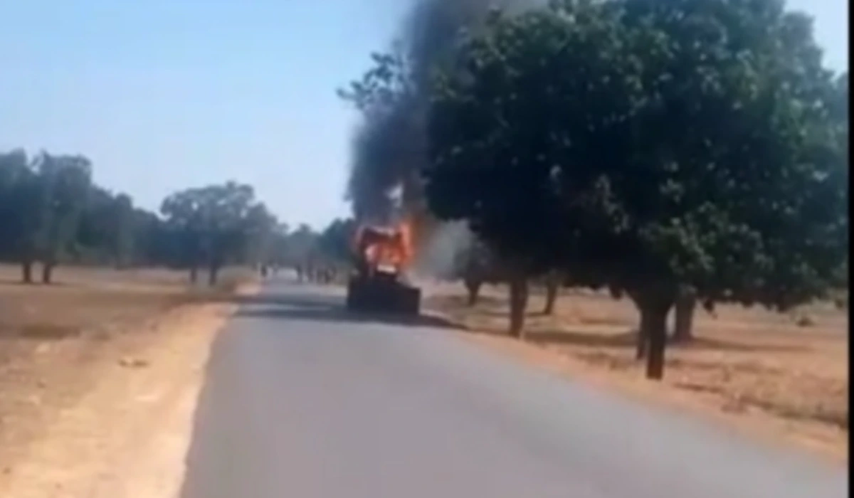 चलाती जेसीबी में लगी भीषण आग, मशीन जलकर खाक।
