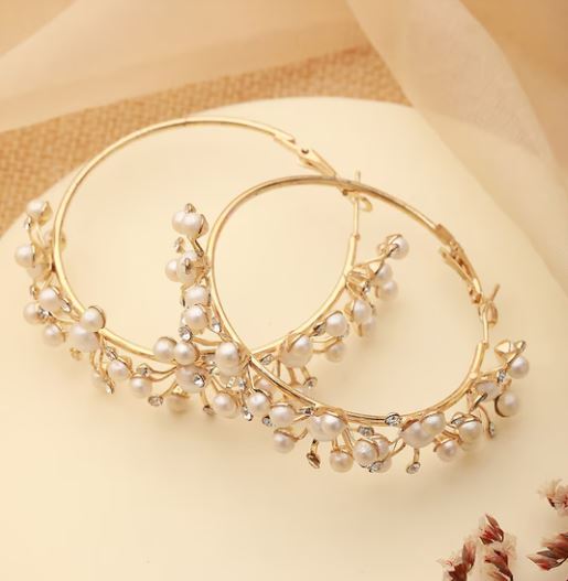 गोल्ड-टोन्ड क्लासिक हूप इयररिंग्स, गोल्ड-प्लेटेड, मोती जड़े हुए हैं। इस इयररिंग को आप पार्टी फंक्शन मे पहनकर जा सकती है।