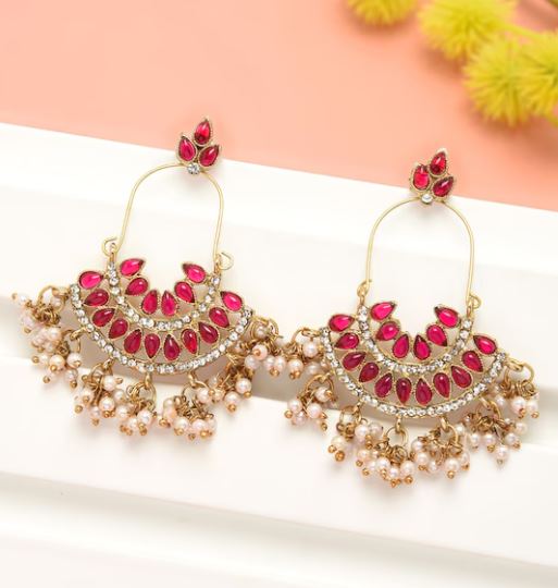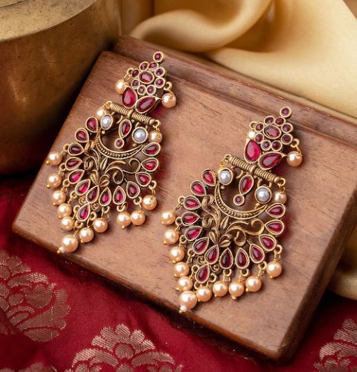 सोने की टोन वाले गोलाकार स्टड मोती पत्थर जड़े हुए हैं। इस तरह के इयररिंग को आप शादी मे पहनकर जा सकती है ये आपके लूक मे चार चाँद लगा देगा।