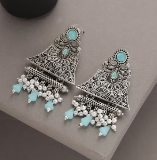 नीले और सफेद गुंबद के आकार के ड्रॉप इयररिंग्स, सिल्वर-प्लेटेड, कृत्रिम पत्थर और मोती से बने हुए हैं जो इसे बेहद खूबसूरत लूक प्रदान कर रहा है।
