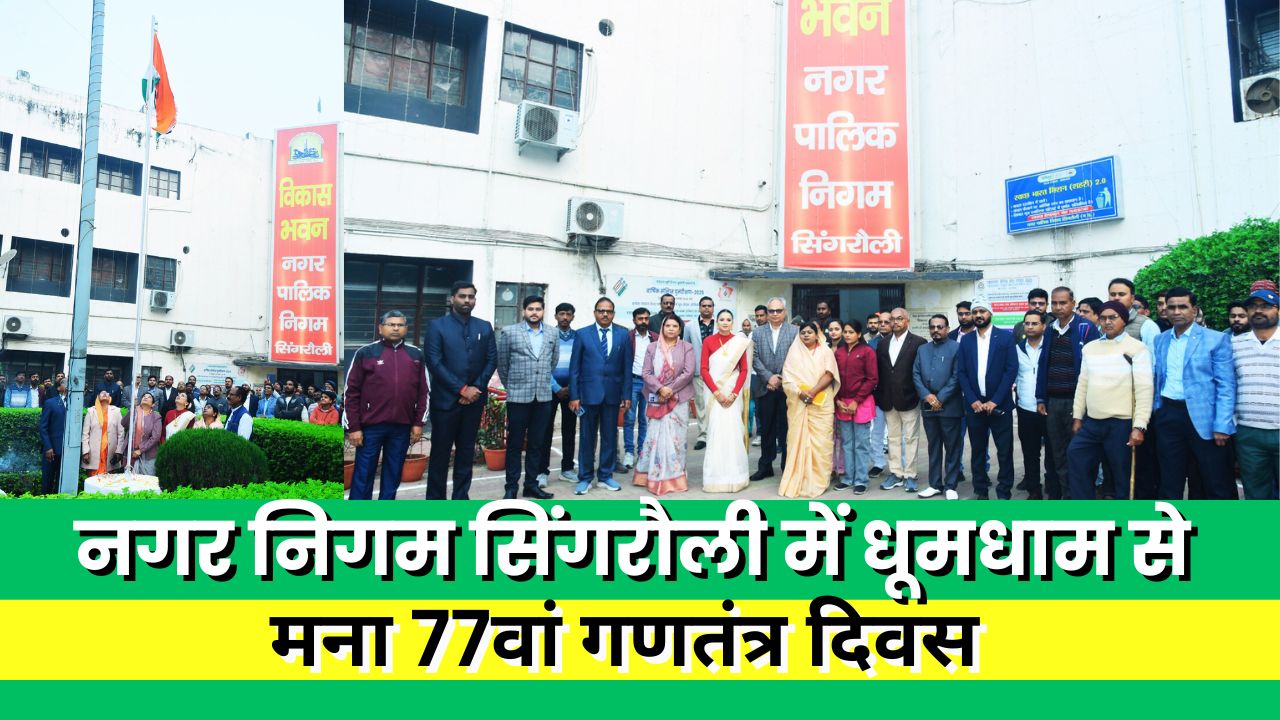 सिंगरौली। देश के 77वें गणतंत्र दिवस के अवसर पर नगर निगम कार्यालय परिसर में देशभक्ति और उल्लास का वातावरण देखने को मिला। कार्यक्रम की शुरुआत नगर निगम महापौर श्रीमती रानी अग्रवाल द्वारा ध्वजारोहण के साथ हुई। इसके पश्चात राष्ट्रगान का सामूहिक गायन किया गया और उपस्थित जनसमूह ने भारत माता के जयघोष के साथ तिरंगे को सलामी दी।