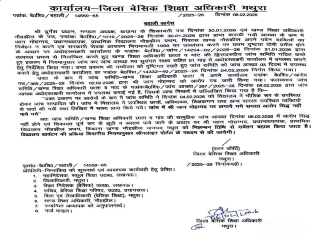 मथुरा जिले के नौहझील स्थित सरकारी प्राथमिक विद्यालय में प्रधानाध्यापक जान मोहम्मद के खिलाफ भाजपा के बाजना मंडल अध्यक्ष द्वारा लगाए गए आरोप झूठी निकली। जांच समिति ने पाया कि आरोपों में कोई प्रमाण नहीं है और सभी शिकायतें झूठी तथा निराधार थीं। इसके बाद बेसिक शिक्षा अधिकारी (बीएसए) ने प्रधानाध्यापक को वापस ससम्मान बहाल कर दिया है।