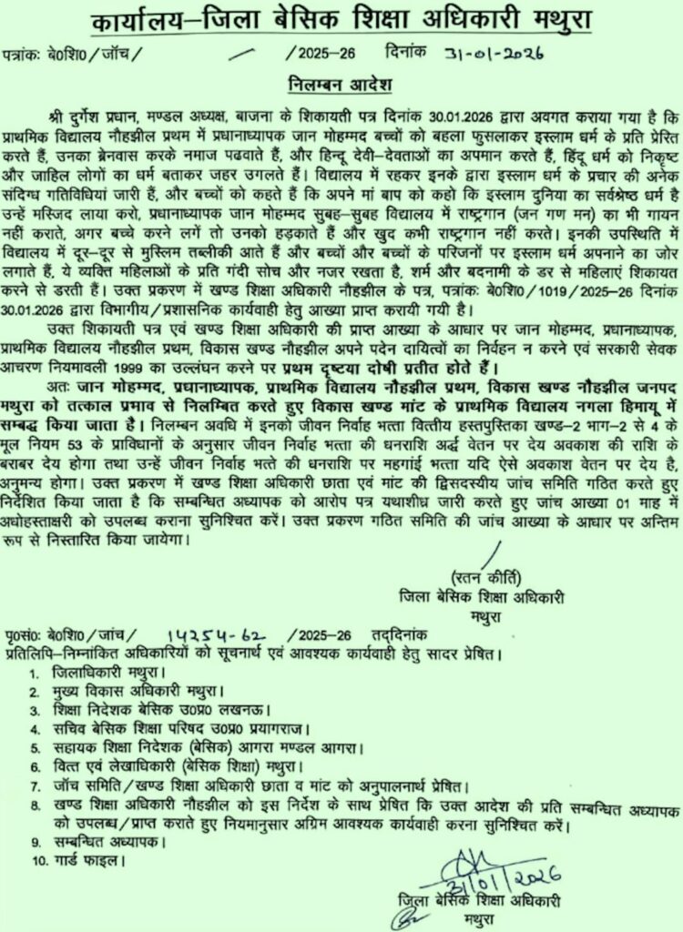 मथुरा के नौहझील प्राथमिक विद्यालय में प्रधानाध्यापक जान मोहम्मद (Headmaster Jaan Mohammad) के खिलाफ 30 जनवरी को भाजपा बाजना मंडल अध्यक्ष द्वारा शिकायत पेश की गई। शिकायत में प्रमुख आरोप यह थे कि विद्यालय में
