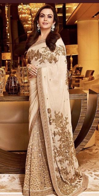 नीता अंबानी का डे-टाइम एलिगेंट लुक अक्सर ऑर्गेंजा एम्ब्रॉयडरी साड़ियों में देखा गया है। हल्के शेड्स और मिनिमल वर्क इन्हें ब्रंच या डे फंक्शन के लिए आइडियल बनाते हैं।
