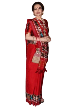 नीता अंबानी का पारंपरिक अंदाज़ उनके पटोला साड़ी लुक्स में साफ झलकता है। इन साड़ियों की रंगीन बुनाई और ज्यामितीय पैटर्न हर मौके पर अलग ही चमक देते हैं।