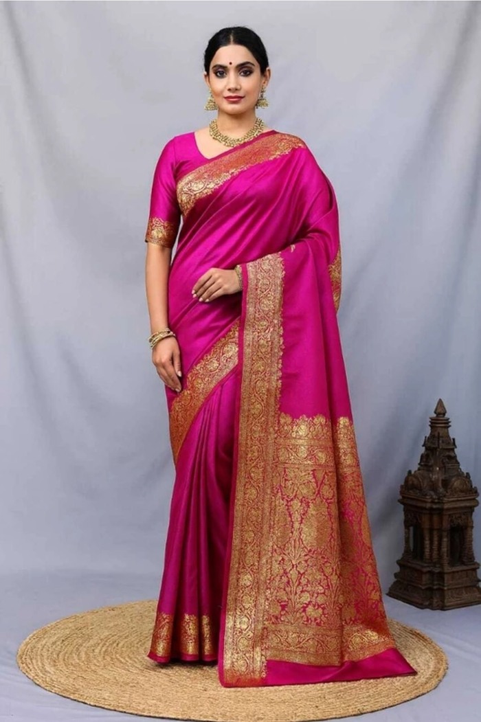 गोल्ड ज़री वर्क वाली यह एक बेहद खूबसूरत साड़ी है। इस क्वीन पिंक रंग की साड़ी को पहनकर आप रॉयल लुक पा सकती हैं। आप इस साड़ी को किसी भी त्यौहार, पार्टी और यहाँ तक कि किसी की शादी में भी पहन सकती हैं। पहनने के बाद इस साड़ी का लुक भी अलग ही हो जाता है।