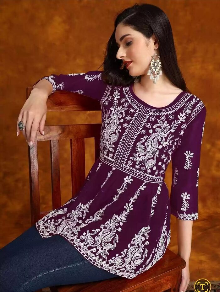 इस बैंगनी रंग की शॉर्ट कुर्ती पर खूबसूरत लखनवी चिकनकारी का काम किया गया है। इस शॉर्ट कुर्ती पर आपको कई आकर्षक रंगों के विकल्प मिलेंगे। यह शॉर्ट कुर्ती रेगुलर स्टाइल में उपलब्ध है। इस कुर्ती को जींस के साथ पहना जा सकता है।