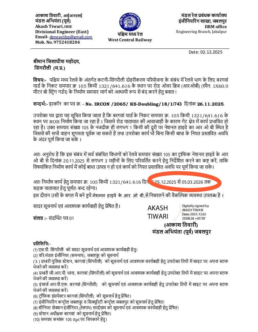 पश्चिम मध्य रेलवे के निर्देश पर मंडल अभियंता (पूर्व) जबलपुर आकाश तिवारी ने आदेश जारी किया है। आदेश के अनुसार: