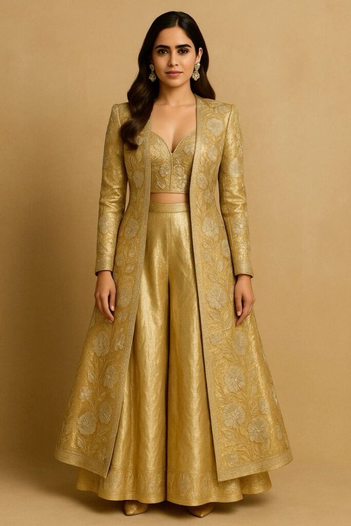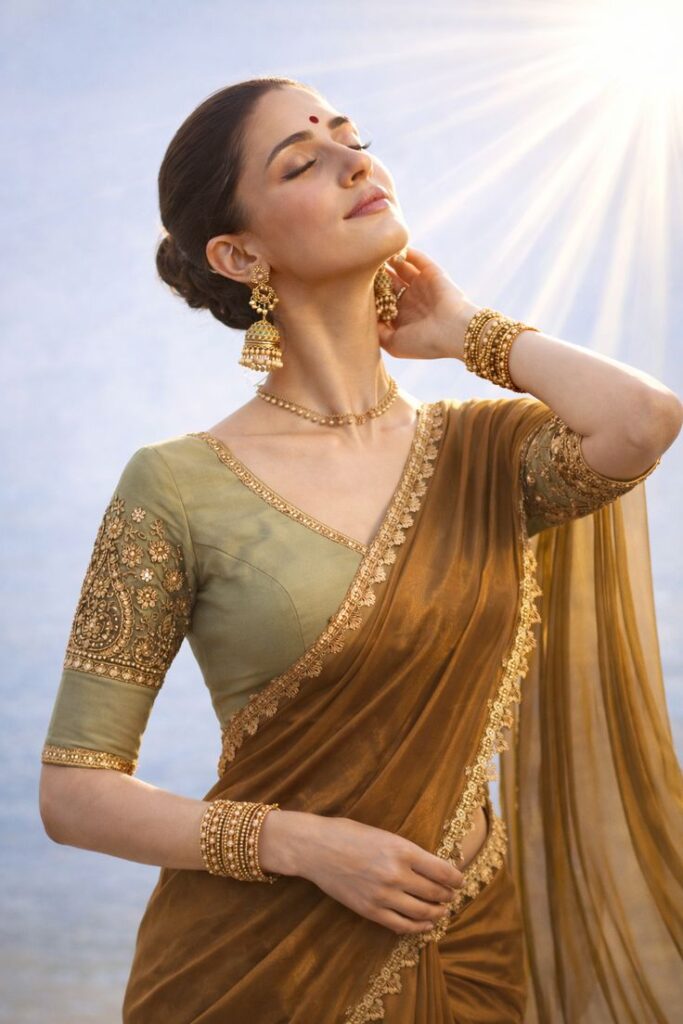 न्यूड लिप्स, हल्का ब्रॉन्जर और नेचुरल आई मेकअप रखें। गोल्ड हूप्स या डेलिकेट चेन अच्छी लगेगी।